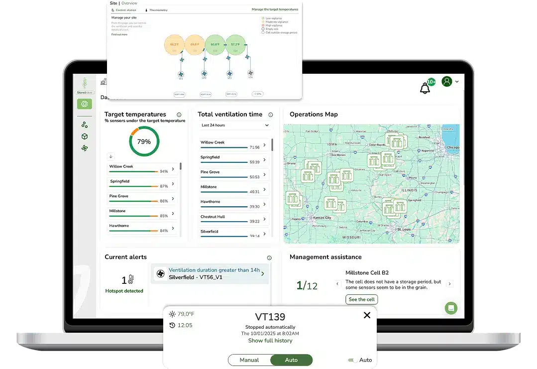 By automating grain cooling and enabling monitoring from anywhere through a single, reliable view of your bins and elevators, Store&save helps you protect grain quality, reduce shrink, and cut energy costs.